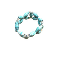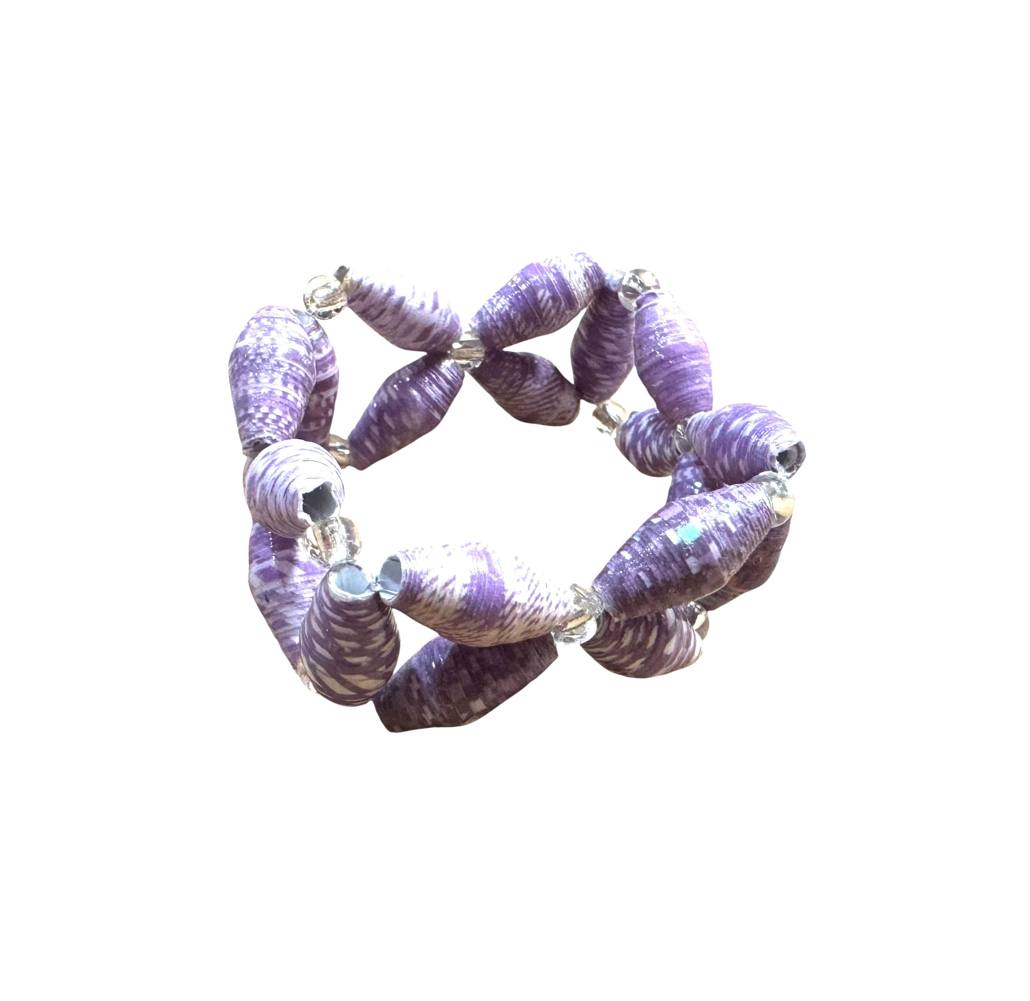 Great for girls, young and younger! This bracelet is made from recycled paper beads and bronze seed beads. Stretches gently.