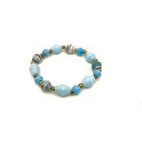 Great for girls, young and younger! This bracelet is made from recycled paper beads and bronze seed beads. Stretches gently.
